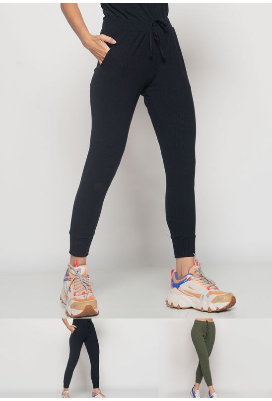 Kit com 2 calças caneladas, com modelagem jogger, estilo COMFY, cintura alta com elástico, e bolsos laterais. Possui cadarço fake. Ter estilo nunca foi tão confortável! Mesmo sendo um modelo despojado, você pode criar combinações incríveis, que vão dar o ar que você quiser ao seu look. Confeccionada em tecido de excelente qualidade com elasticidade e toque super macio. Modelo veste tamanho P. Medidas da modelo: Altura 1,70 – Busto 88 – Cintura 61 – Quadril 92 – Manequim 36. Composição: 63% Poliéster, 34% Viscose, 3% Elastano.