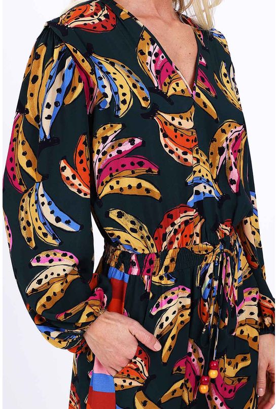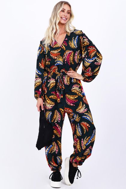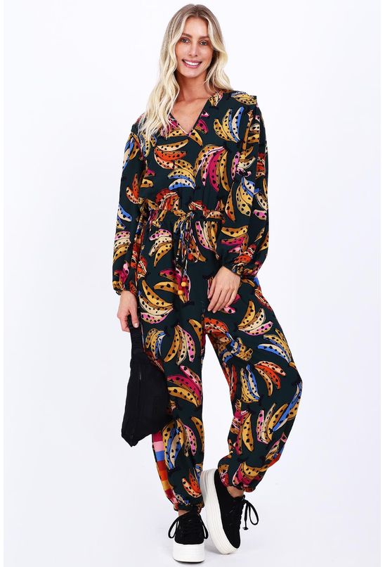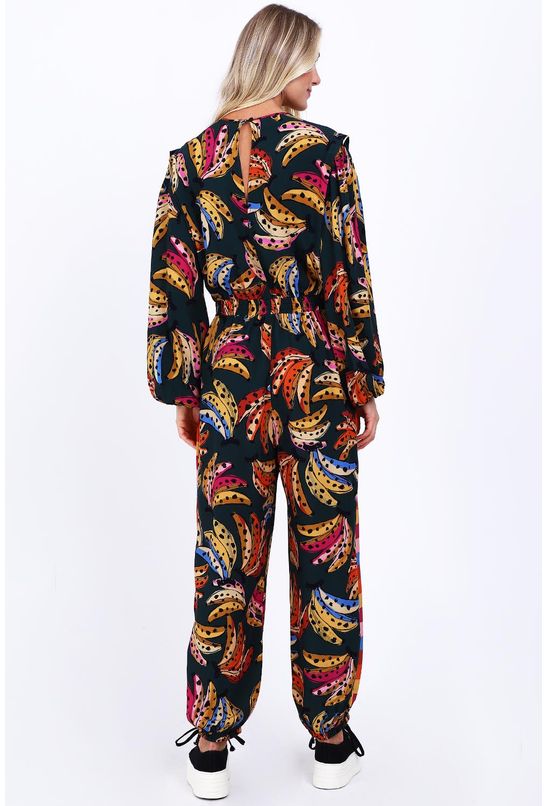 Macacao farm longo, decote em v, estampado , cor verde, manga longa, tecido viscose. *as peças podem variar de estampa e tonalidade.