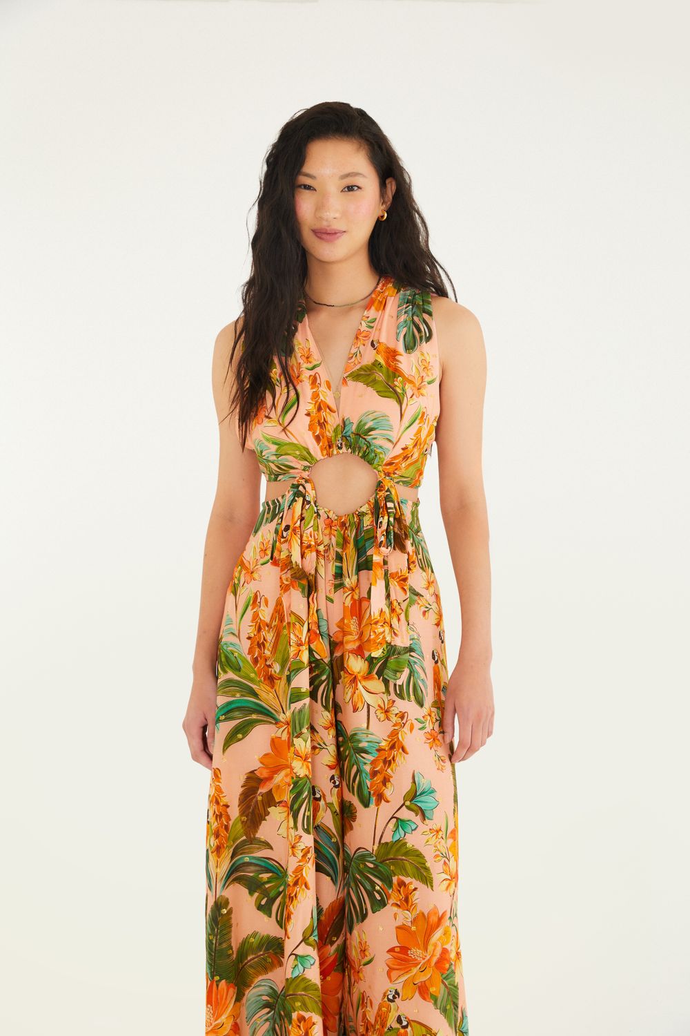 macacão estampado canto dos pássaros. apresenta decote delicado e alças ajustáveis, que oferecem conforto e estilo. possui amarração frontal que adiciona charme à peça. a modelagem solta garante liberdade nos movimentos, sendo ideal para um dia casual na cidade ou um passeio ao ar livre. FARM RIO original -alto verão 26.-