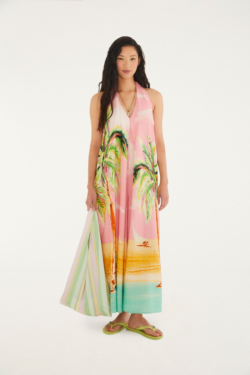macacão estampado coqueirão. este macacão é a definição de frescor e originalidade, com um design sem alças e ombros à mostra que confere um toque moderno. a modelagem fluida e confortável é complementada por um decote profundo e cavas ajustáveis. perfeito para passeios à beira-mar ou encontros casuais. FARM RIO original - alto verão 26.-