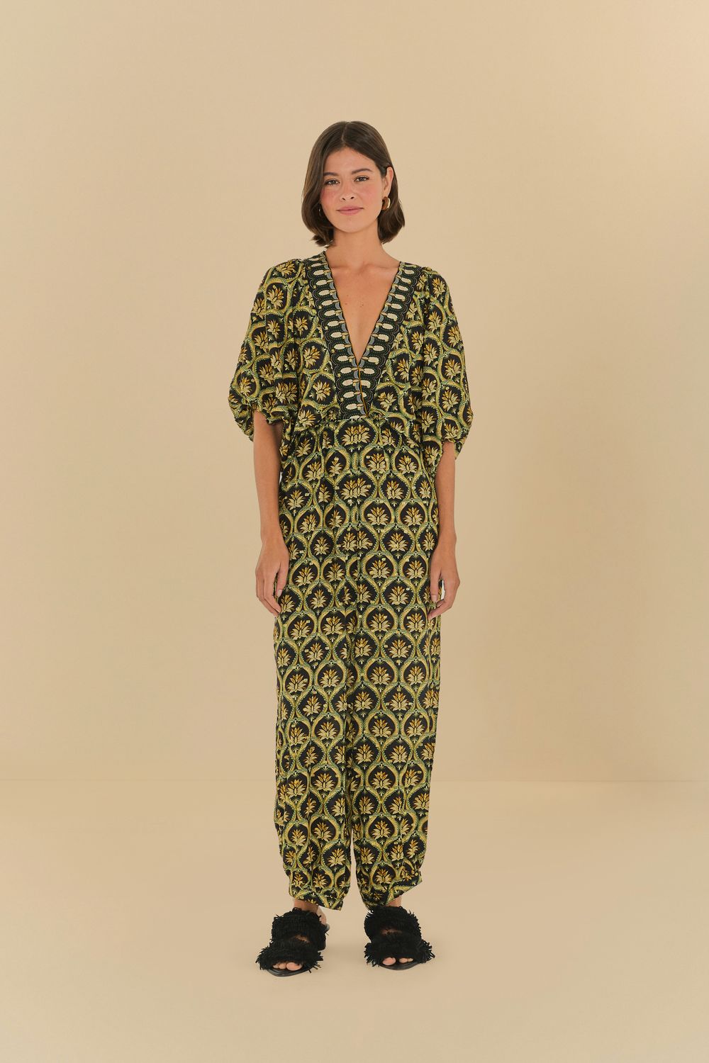 macacão estampado joia boho. decote em v profundo com bordado delicado nas bordas. mangas amplas e fluidas que adicionam movimento à peça. corte leve que prioriza conforto, ideal para ocasiões casuais e encontros especiais. uma peça que transforma qualquer look com simplicidade e autenticidade. FARM RIO original - inverno 25.-