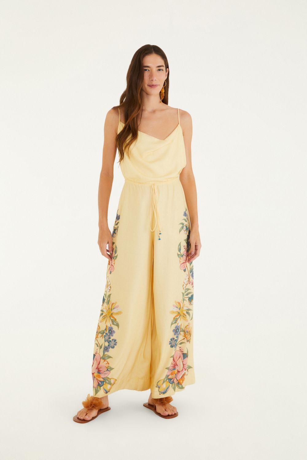 macacão estampado maira lenço. com alças delicadas e decote suave em formato v, o macacão se destaca pela fluidez e leveza em sua modelagem ampla. perfeito para momentos casuais que pedem conforto e estilo, imprime originalidade em cada detalhe. FARM RIO original - verão 26.-