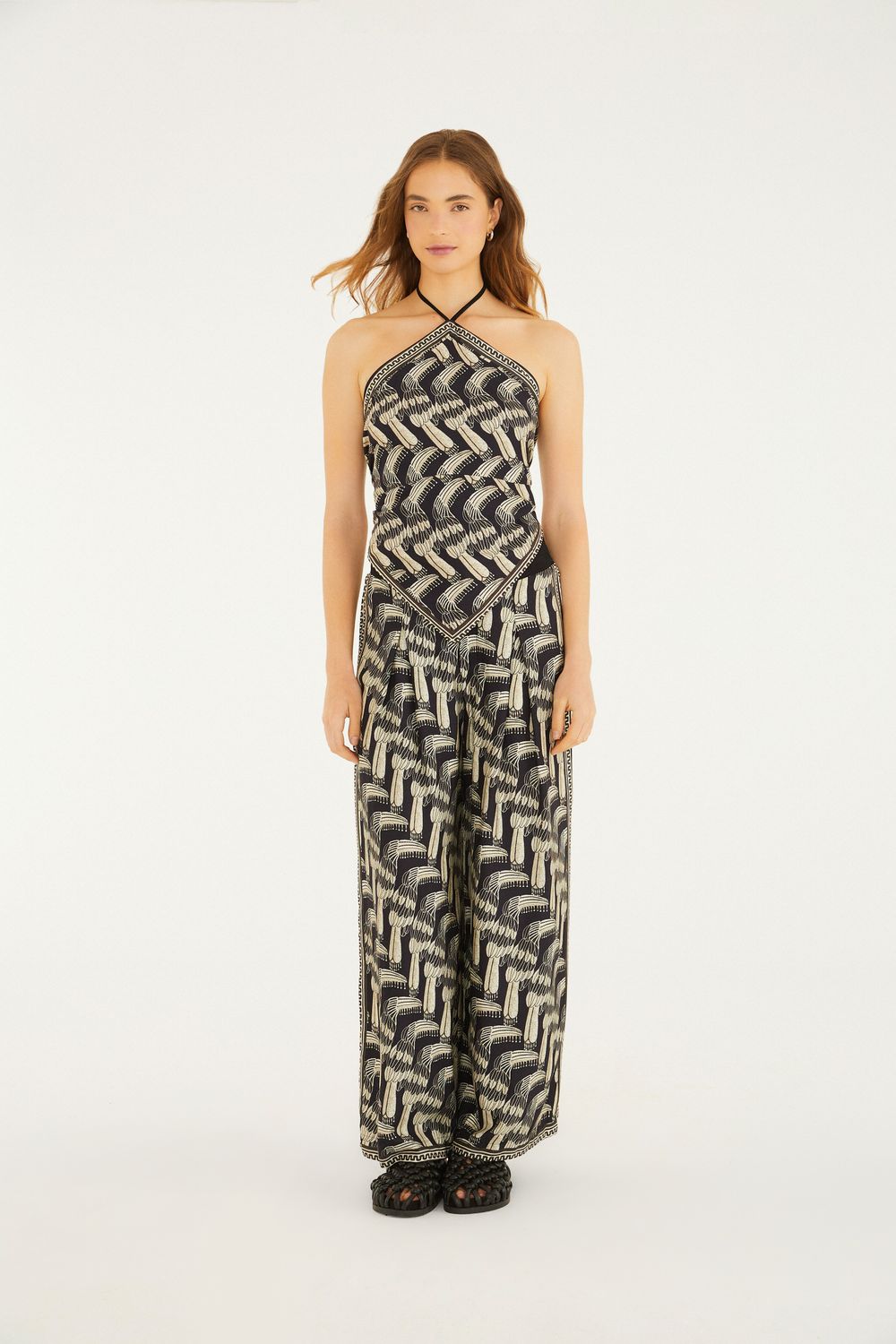 macacão tucanario. com decote frente única e amarração nas costas, o modelo sem mangas proporciona frescor e estilo. a calça ampla garante movimento e conforto, tornando essa peça uma escolha ideal para ocasiões casuais. tecido leve e design fluido elevam qualquer visual. FARM Rio, coleção Carioca - inverno 26.-