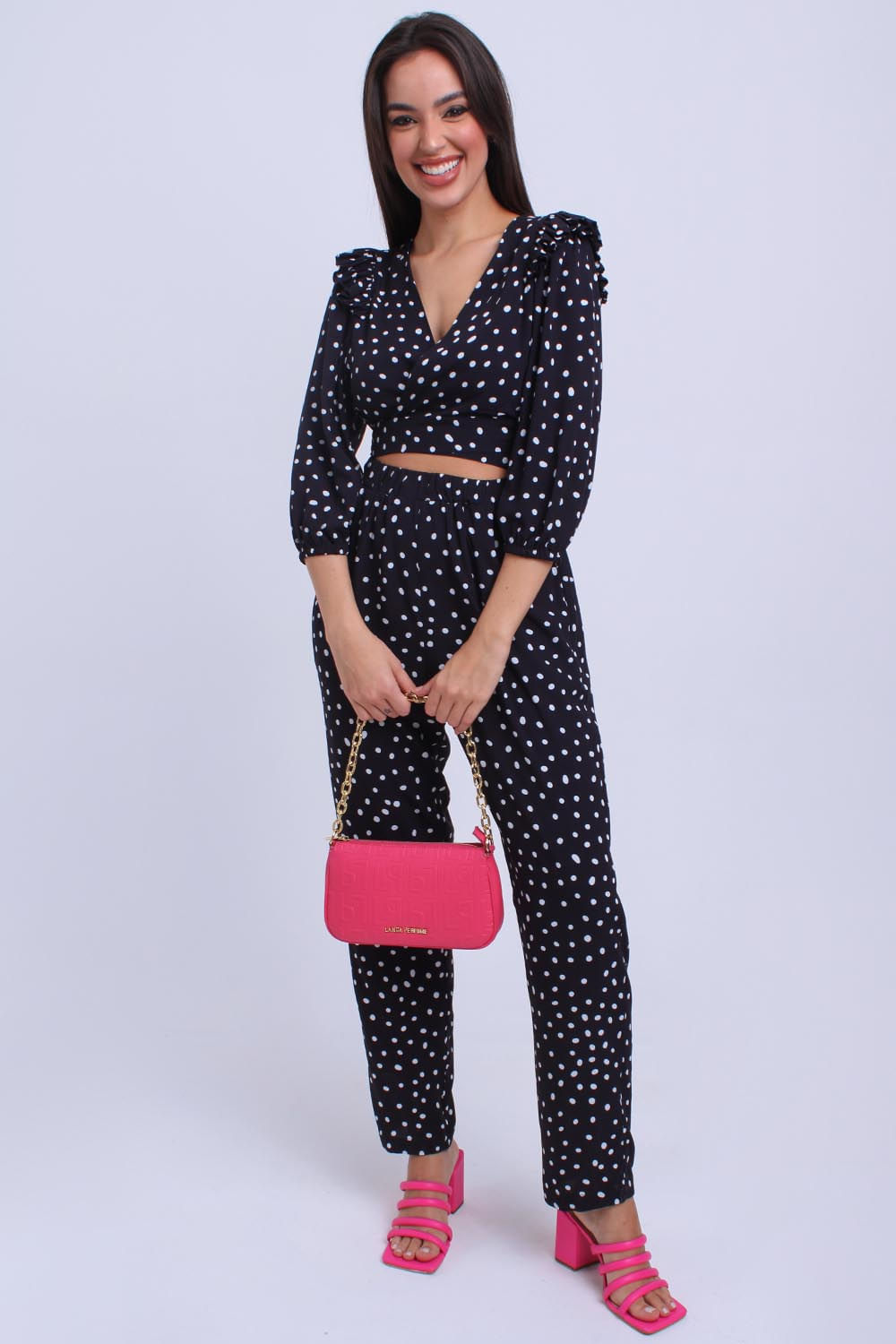 Macacão preto com estampa poá, possui parte de cima modelo cropped com decote em V transpassado, mangas bufantes e detalhes de babadinhos nos ombros. A calça possui modelo cenoura, cós em elástico largo com detahes drapeados na cintura e bolsos laterais.