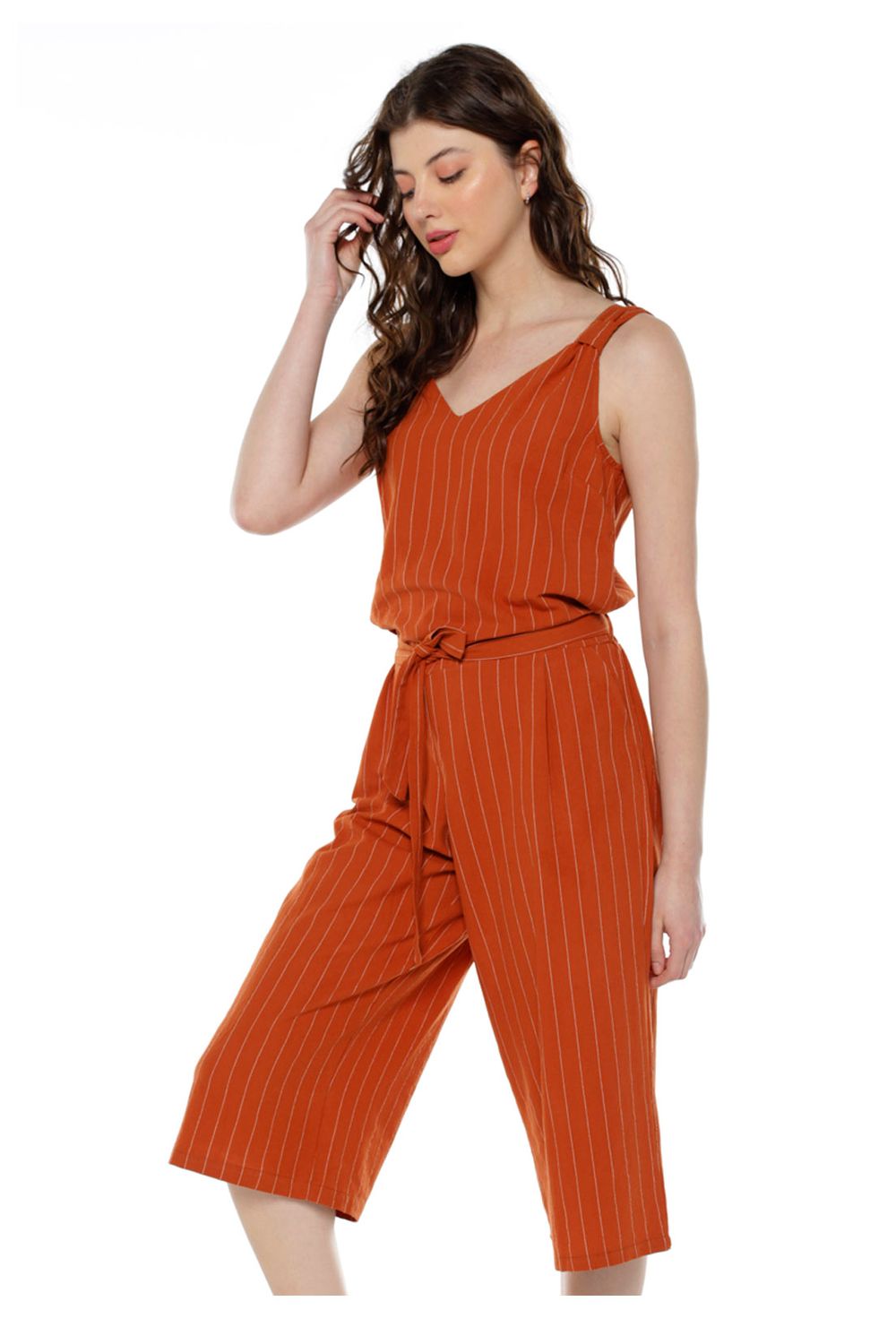 Macacão Pantacourt em Linho e Algodão Listrado Sob Terracota