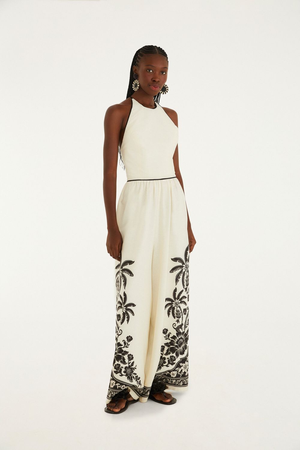 macacão pantalona estampado guanacaste. apresenta decote halter que destaca o colo, com uma modelagem sem mangas que valoriza os ombros. a cintura ganha definição sutil enquanto a pantalona ampla proporciona movimento e fluidez. look ideal para eventos diurnos ou noites casuais. FARM RIO original - verão 26.-