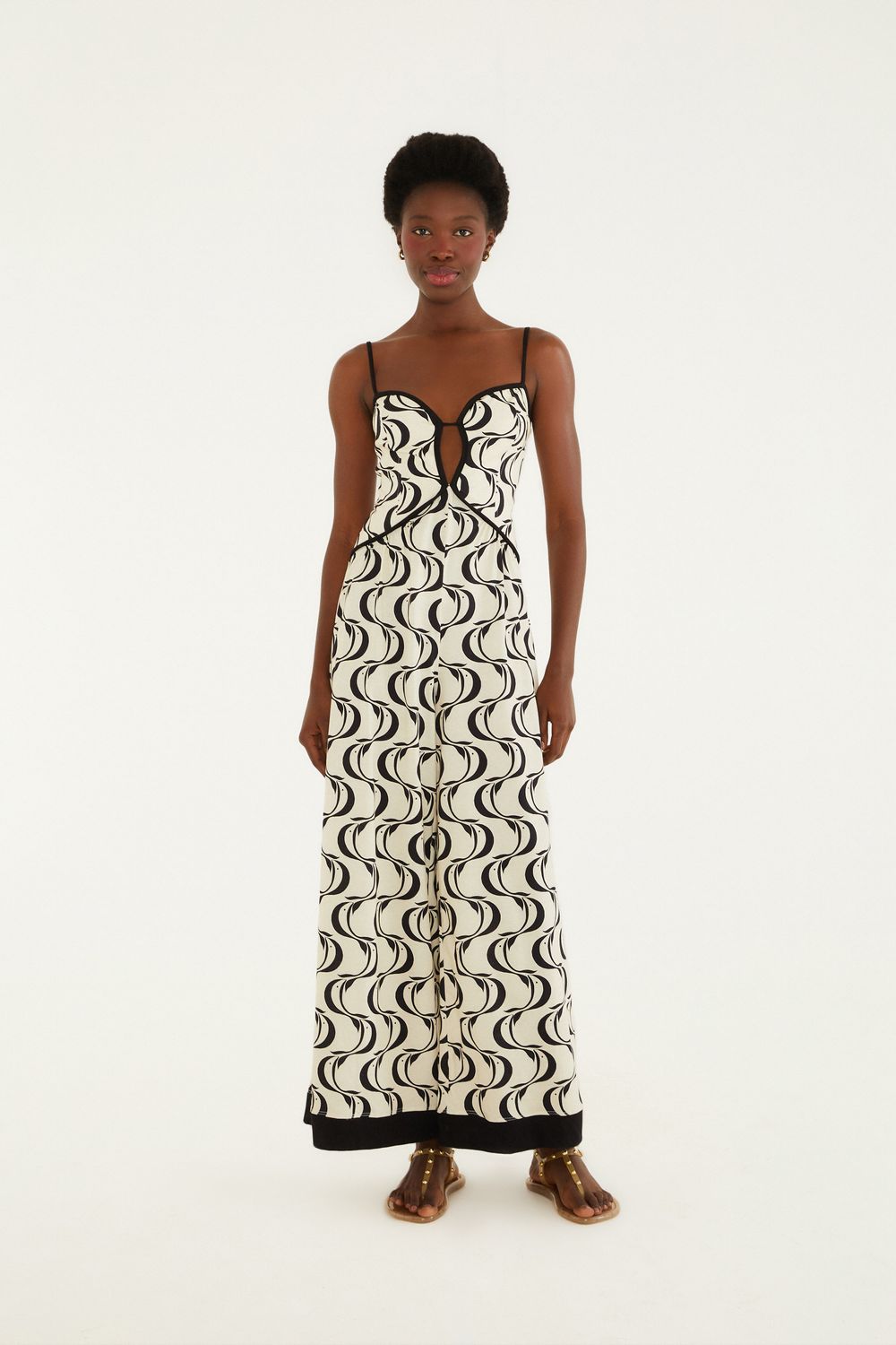 macacão vivo estampado peixe copa. com decote profundo e alças finas ajustáveis, apresenta caimento solto e confortável. o tecido leve proporciona liberdade de movimento e o acabamento delicado traz um toque de charme especial. ideal para dias de lazer e noites casuais, combina com diversas ocasiões. FARM RIO original - alto verão 26.-