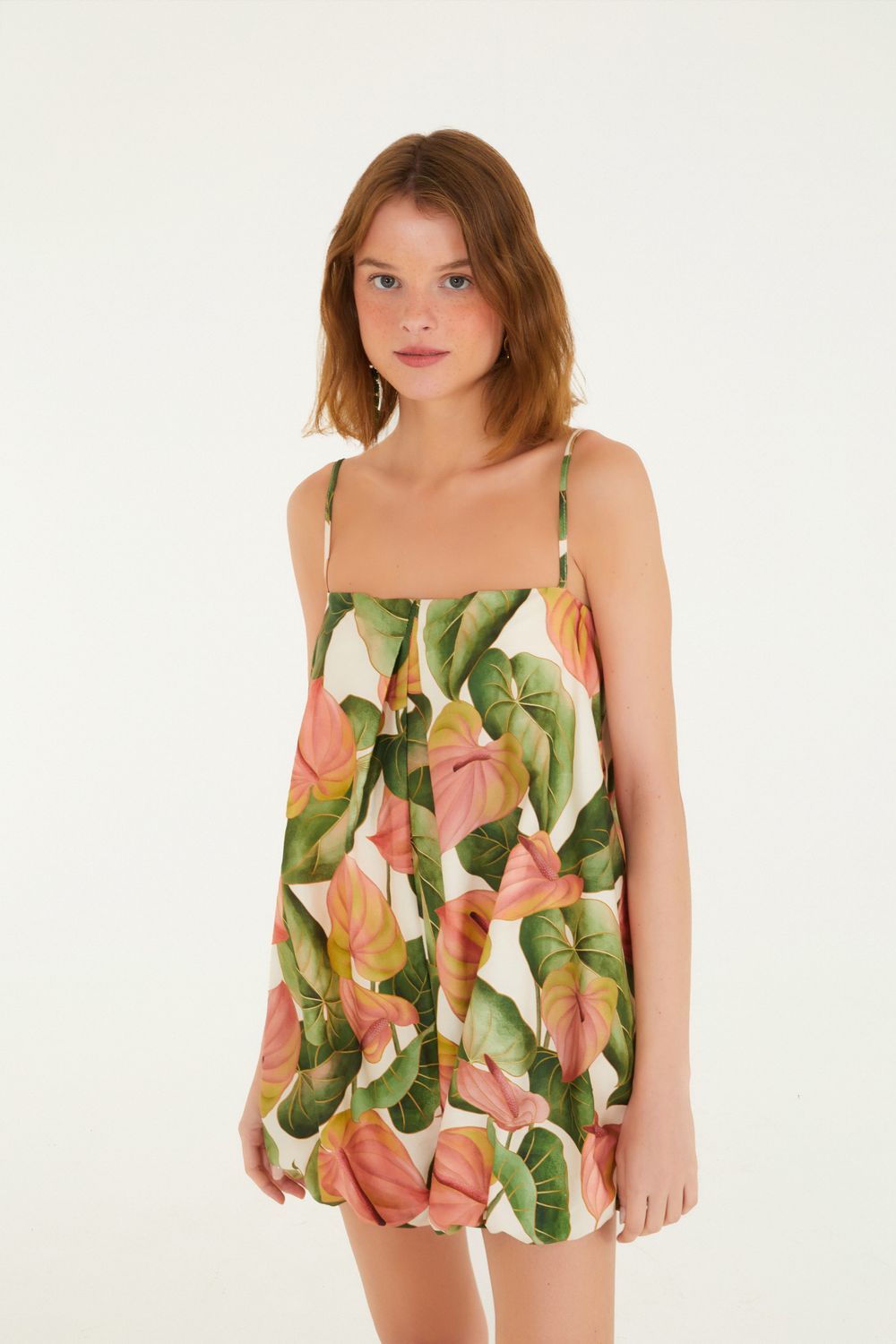macaquinho balonê estampado anturio corrido. com alças ajustáveis e decote reto que traz leveza, a peça destaca-se pela modelagem balonê, conferindo um toque moderno e sofisticado. perfeito para momentos casuais e para os dias de calor, representa a essência do verão com autenticidade. FARM RIO original - verão 26.-