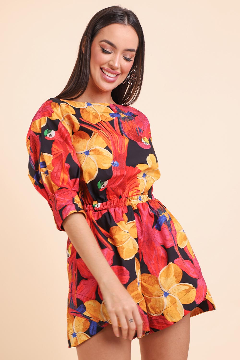 Macaquinho em tricoline de algodão, possui estampa exclusiva em cores contrastantes, mangas bufantes com fechamento nos punhos, decote canoa e recorte posterior com fechamento por botões e aselhas.