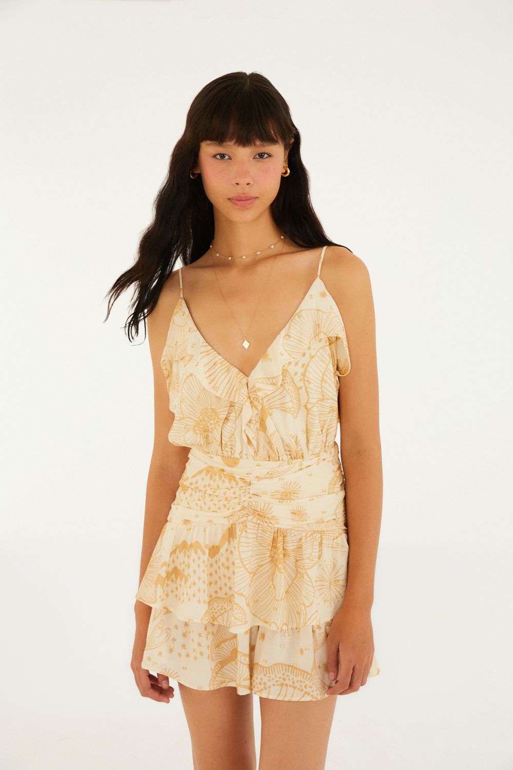 macaquinho estampado jardim místico. com alças finas e decote em v, ele traz um toque leve e fluido com seus babados delicados. a cintura é marcada por um elástico suave, proporcionando conforto e estilo. perfeito para ocasiões casuais, é a peça versátil que faltava no seu guarda-roupa. FARM RIO original - alto verão 26.-
