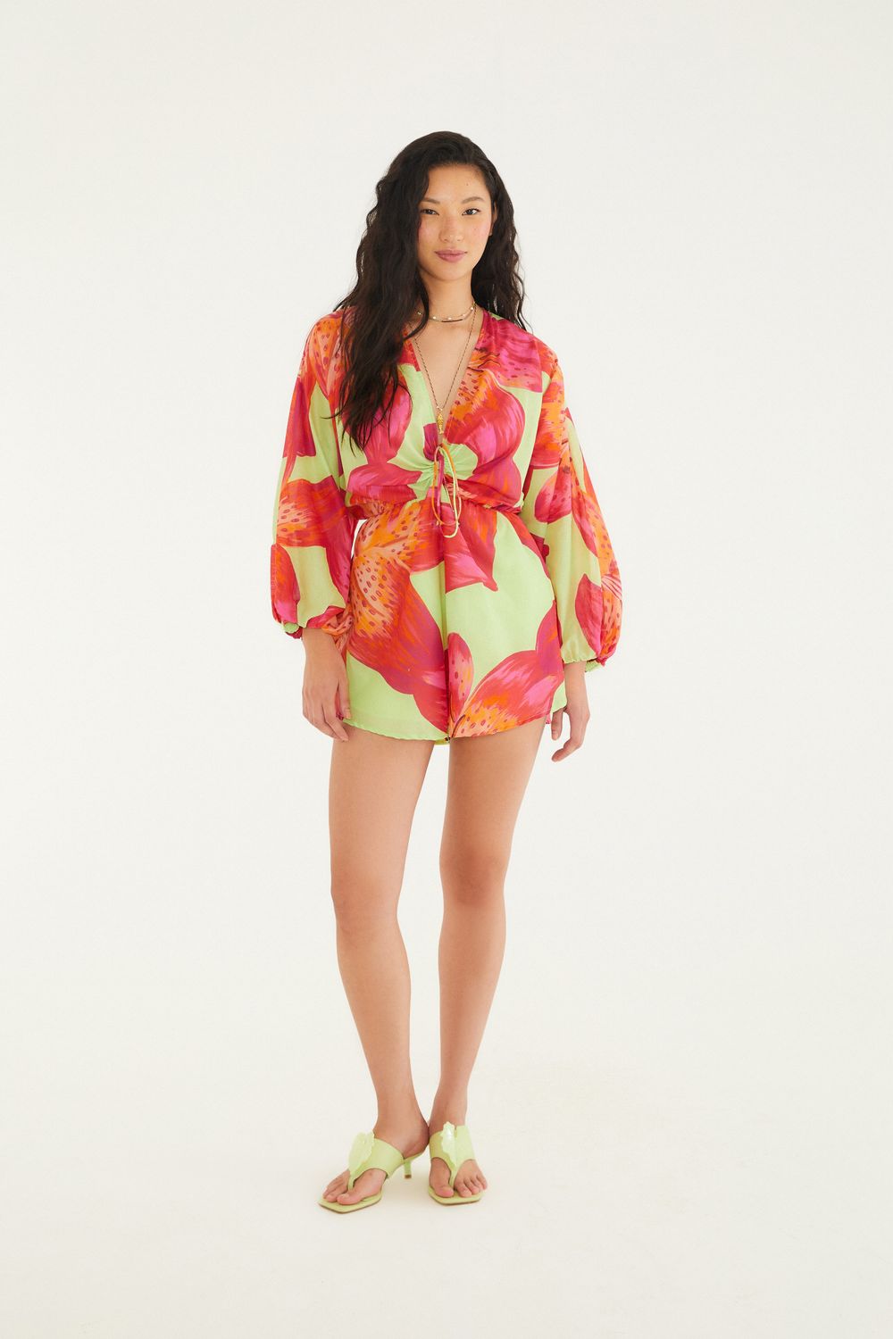 macaquinho estampado lírio tropical. possui decote em v e amarração frontal ajustável para um toque personalizado. mangas alongadas com punhos elásticos oferecem conforto e estilo casual. confeccionado em tecido leve, ideal para dias ensolarados e passeios ao ar livre. FARM RIO original - alto verão 26.-