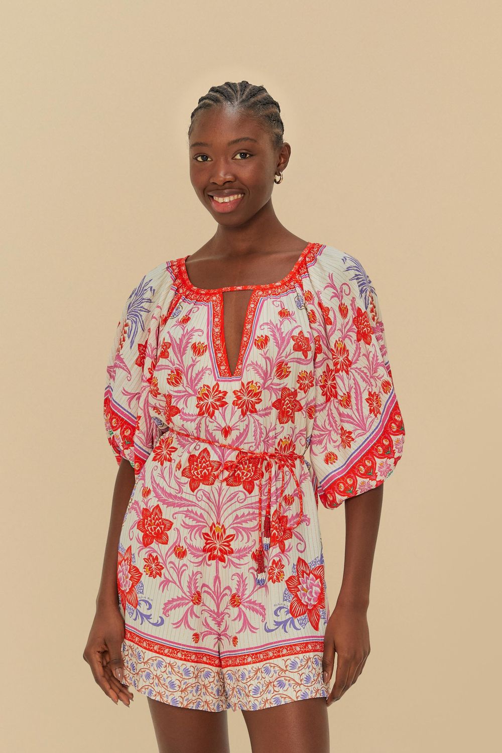macaquinho estampado lisboa traz leveza e autenticidade com seu decote redondo com abertura frontal para amarração. as mangas volumosas e a cintura marcada pelo cordão ajustável proporcionam conforto e estilo. perfeito para dias casuais e encontros ao ar livre. FARM RIO original - inverno 25.-