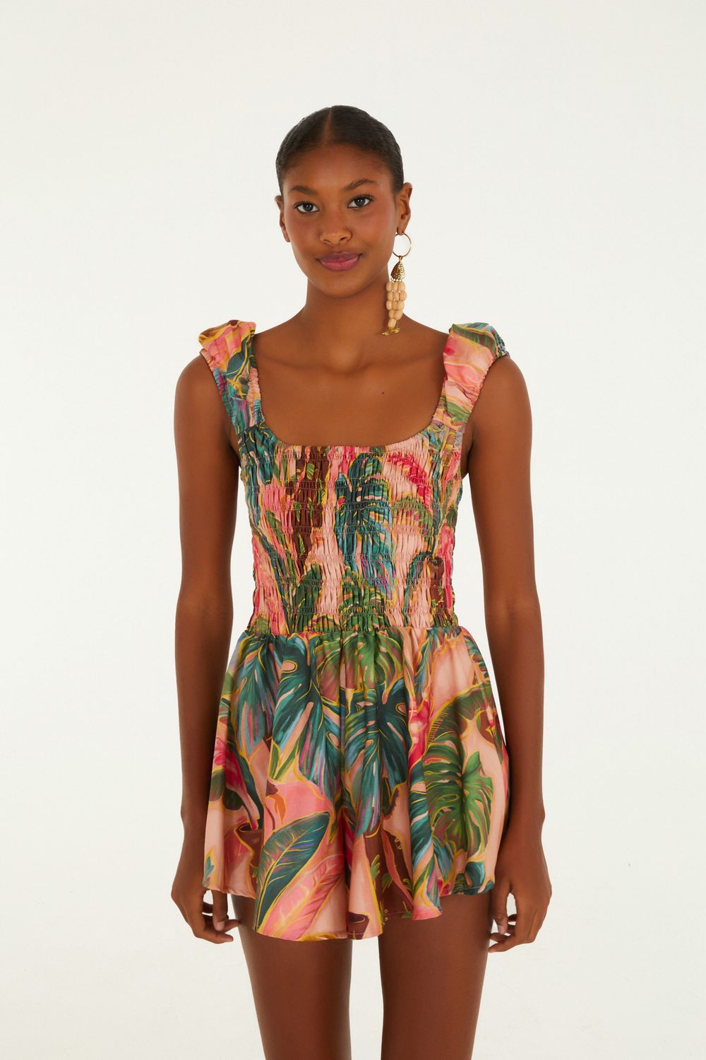 macaquinho estampado piscina tropical. possui decote reto, alças largas e detalhes em babados que se destacam na peça. com acabamento impecável, é perfeito para um passeio à beira-mar ou uma tarde casual. a leveza do tecido eleva o conforto e o estilo para qualquer ocasião. FARM RIO original - verão 26.-