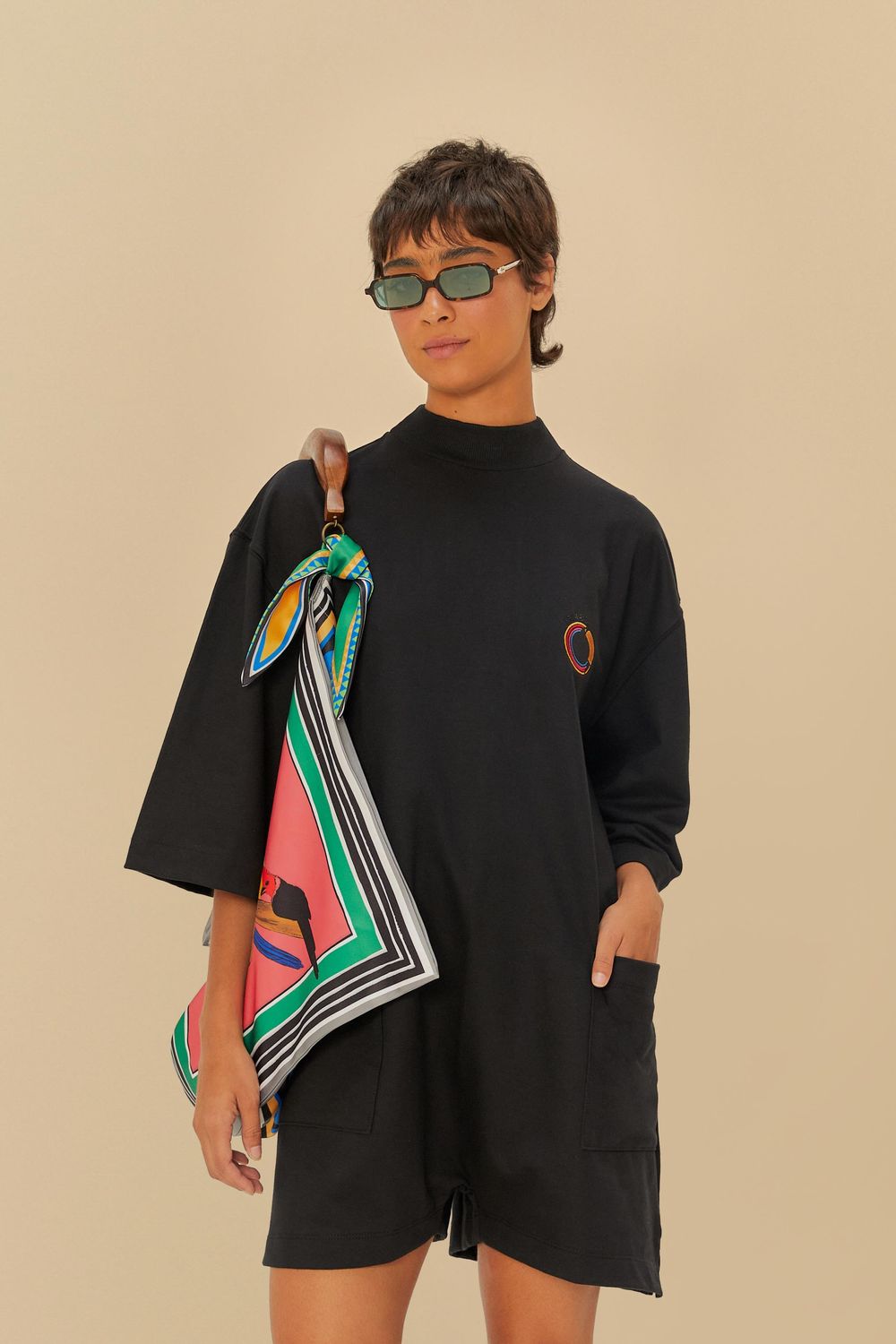 macaquinho moletom bordado logotuca. possui gola alta, mangas amplas três quartos e dois bolsos frontais que acrescentam funcionalidade. o corte solto proporciona conforto absoluto, enquanto o bordado discreto adiciona um toque único. perfeito para dias casuais com estilo e personalidade. FARM RIO original - inverno 25.-