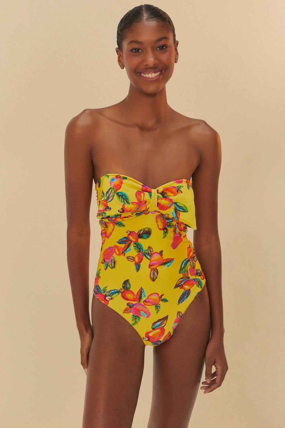 maiô estampado laços caju céu. traz um toque de charme com design sem alças e laço frontal que eleva a peça. confeccionado em material confortável, é perfeito para um dia de sol na praia ou relaxar à beira da piscina. a base colorida e alegre complementa qualquer ocasião com um visual casual e autêntico. FARM RIO original - inverno 25.-