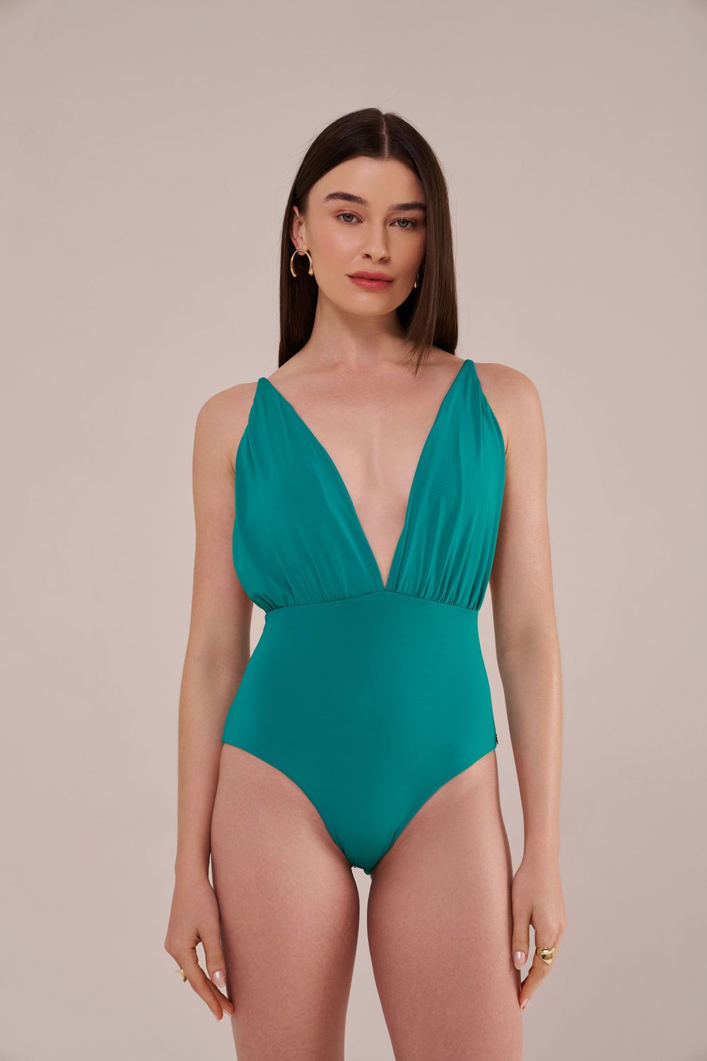 maiô frente única em tecido biodegradável verde com toque gelado e secagem rápida. seu tecido tem proteção UVA, UVB 50 e tecnologia anticloro, ou seja, resiste até 10x mais ao cloro comparado com os elastanos convencionais. o fio de elastano usado na composição além de resistir ao cloro, também protege a peça de agentes externos como o calor e produtos de proteção solar. com decote frontal profundo, possui alças finas paralelas nas costas, deixando a pele à mostra. peça ousada e elegante, deixa qualquer look poderoso e veste vários biotipos.-