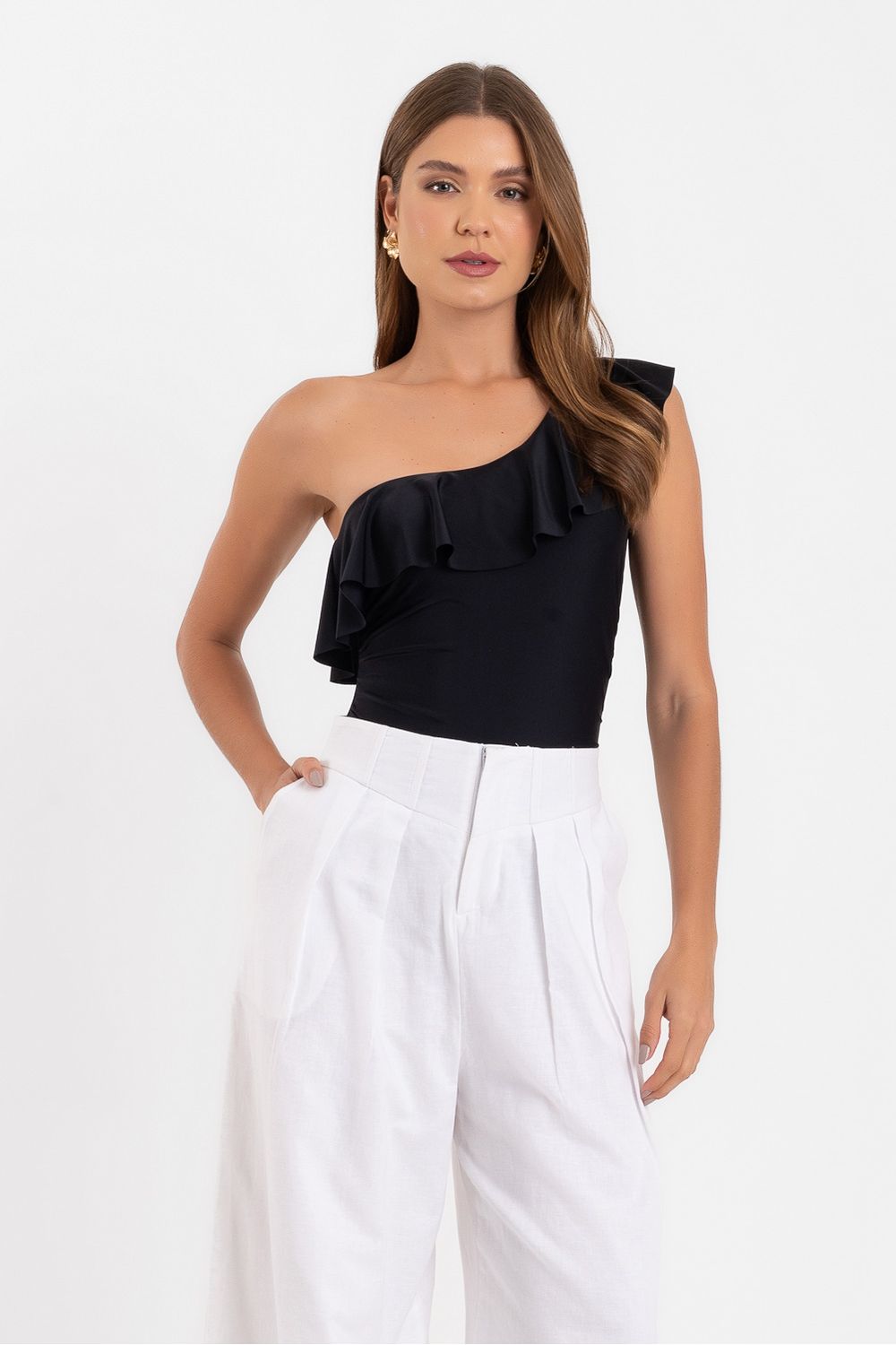 Maiô ombro único babado sobreposto preto
