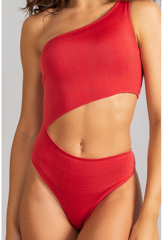 Maiô Laranja Coral em tricot com tramas fechadas, modelo um ombro, com abertura estratégica grande na silhueta.