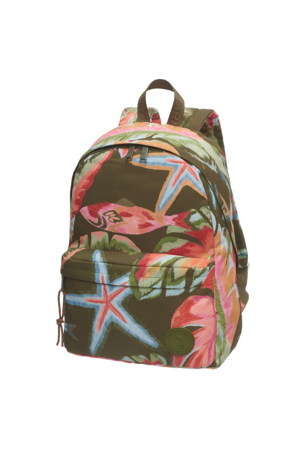 Mochila costas estampada confeccionada em poliéster, bolso frontal com logo emborrachado, alças estampadas ajustáveis com bolso para cartão, puxadores de zíper personalizados em metal colorido com logo em baixo relevo e corda com ponta emborrachada, costura personalizada no painel traseiro e etiqueta emborrachada costurada.-