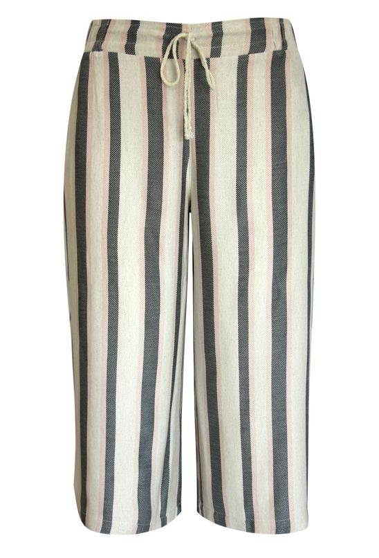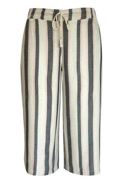 Calça pantacourt em linho, listrado, com cintura média-alta.