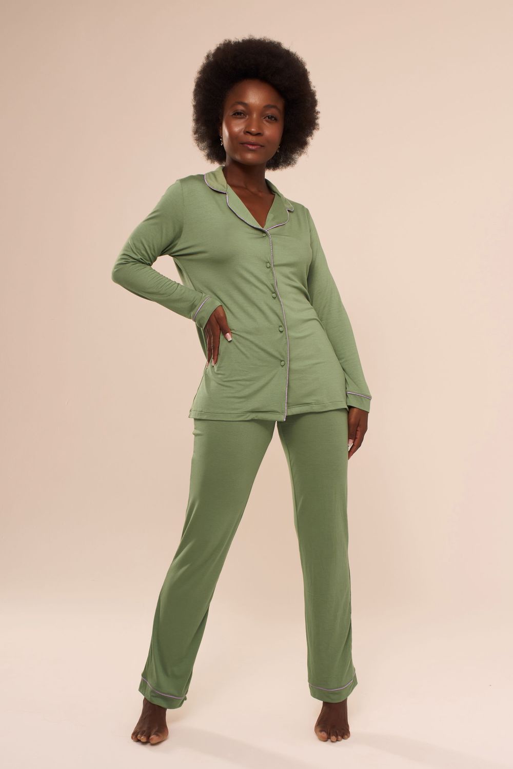 O pijama Classic como o nome próprio já diz, é um pijama atemporal. Sua modelagem clássica é elegante e cheia de conforto. Todo em viscolycra com detalhes de vivos contrastantes e fechamento com botões. O conjunto com manga longa e calça é ideal para meia estação ou inverno. O tom verde Alecrim é calmo e suave. Emana tranquilidade e vai bem com qualquer tom de pele.-