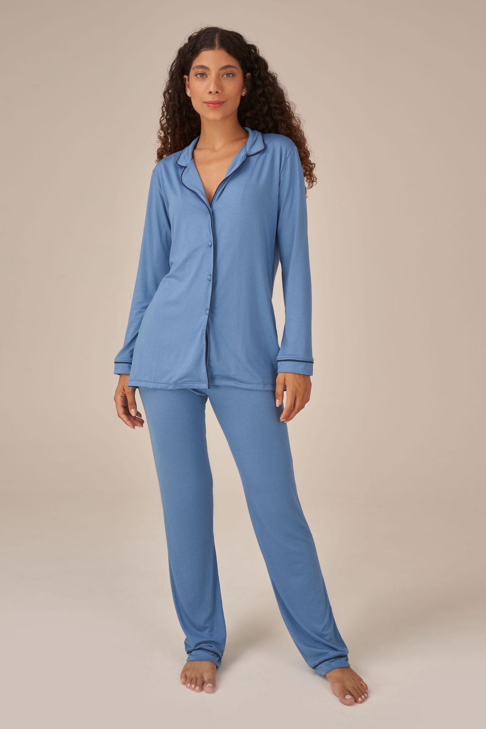 O pijama Classic como o nome próprio já diz, é um pijama atemporal. Sua modelagem clássica é elegante e cheia de conforto. Todo em viscolycra com detalhes de vivos contrastantes. Fechamento com botões. O conjunto com manga longa e calça é ideal para meia estação ou inverno. A cor Lagoon é um azul denso que simboliza calma, ideal para uma boa noite de sono.-