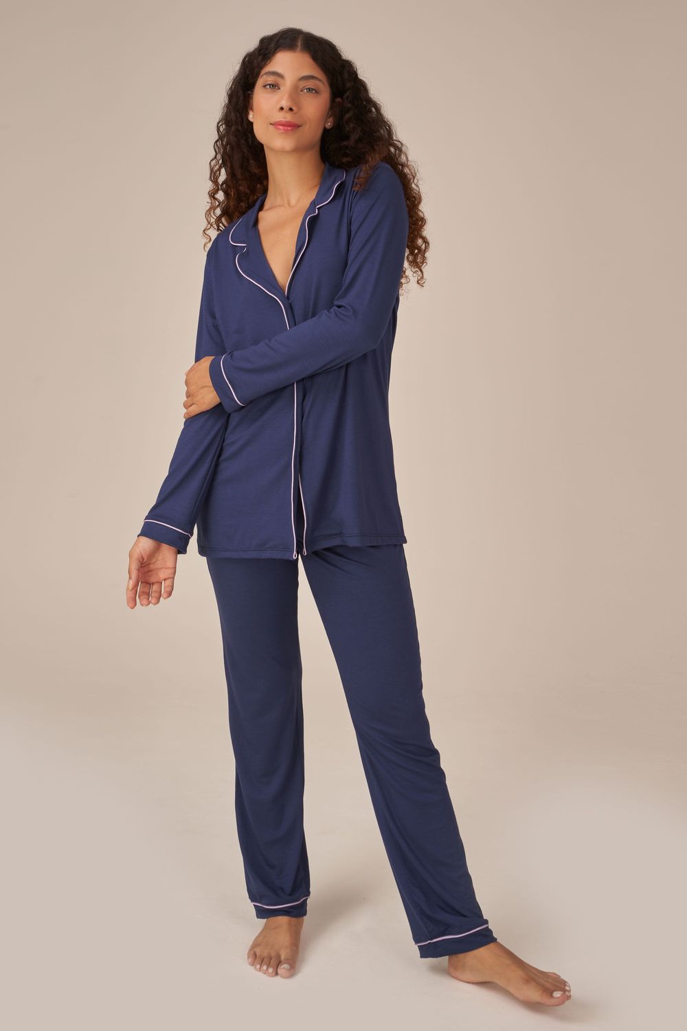 O pijama Classic como o nome próprio já diz, é um pijama atemporal. Sua modelagem clássica é elegante e cheia de conforto. Todo em viscolycra com detalhes de vivos contrastantes. Fechamento com botões. O conjunto com manga longa e calça é ideal para meia estação ou inverno. Na cor marinho este conjunto fica ainda mais chique.-