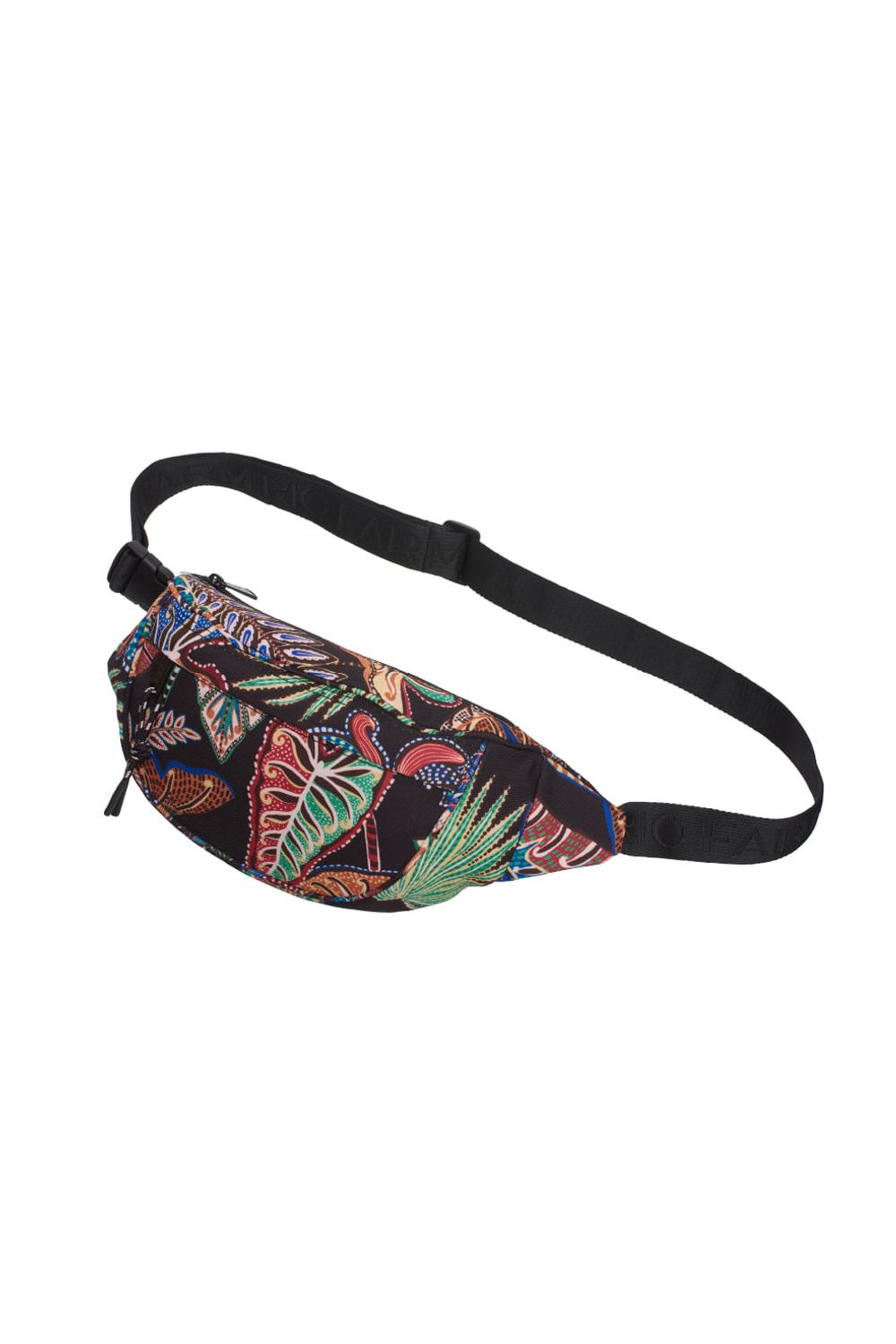 Pochete estampada confeccionada em poliéster com bolso frontal, alça personalizada ajustável com fivela plástica e puxadores de zíper personalizados em metal colorido com logo em baixo relevo e corda com ponta emborrachada.