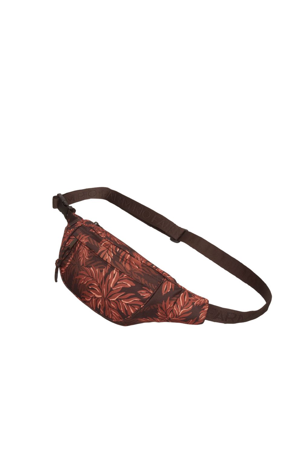 Pochete estampada confeccionada em poliéster com bolso frontal, alça personalizada ajustável com fivela plástica e puxadores de zíper personalizados em metal colorido com logo em baixo relevo e corda com ponta emborrachada.