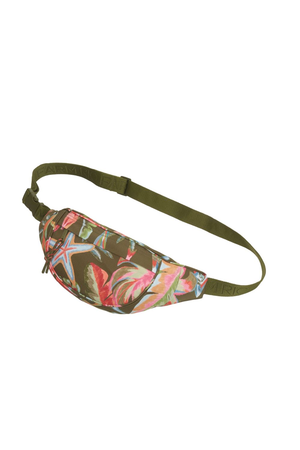 Pochete estampada confeccionada em poliéster com bolso frontal, alça personalizada ajustável com fivela plástica e puxadores de zíper personalizados em metal colorido com logo em baixo relevo e corda com ponta emborrachada.-