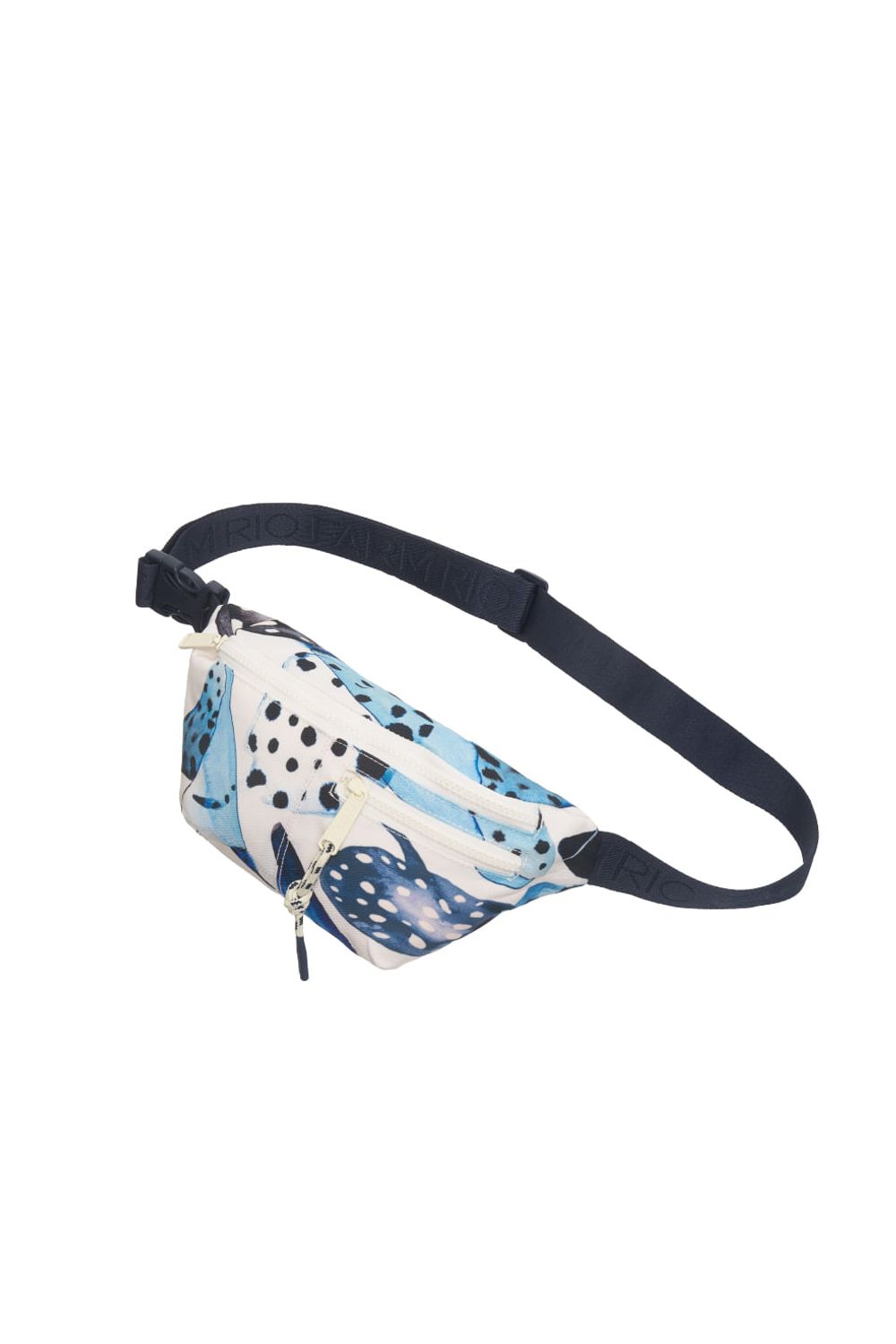 Pochete estampada confeccionada em poliéster com bolso frontal, alça personalizada ajustável com fivela plástica e puxadores de zíper personalizados em metal colorido com logo em baixo relevo e corda com ponta emborrachada.