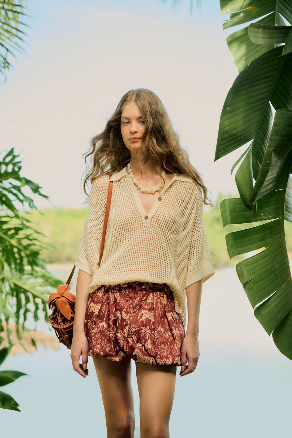 polo tricot telado é a escolha perfeita para quem busca um toque único em qualquer ocasião. com gola clássica e fecho frontal, as mangas amplas caem de forma leve e confortável. a trama delicada adiciona personalidade à peça, ideal para combinações com shorts ou calças. FARM RIO original - verão 26.-
