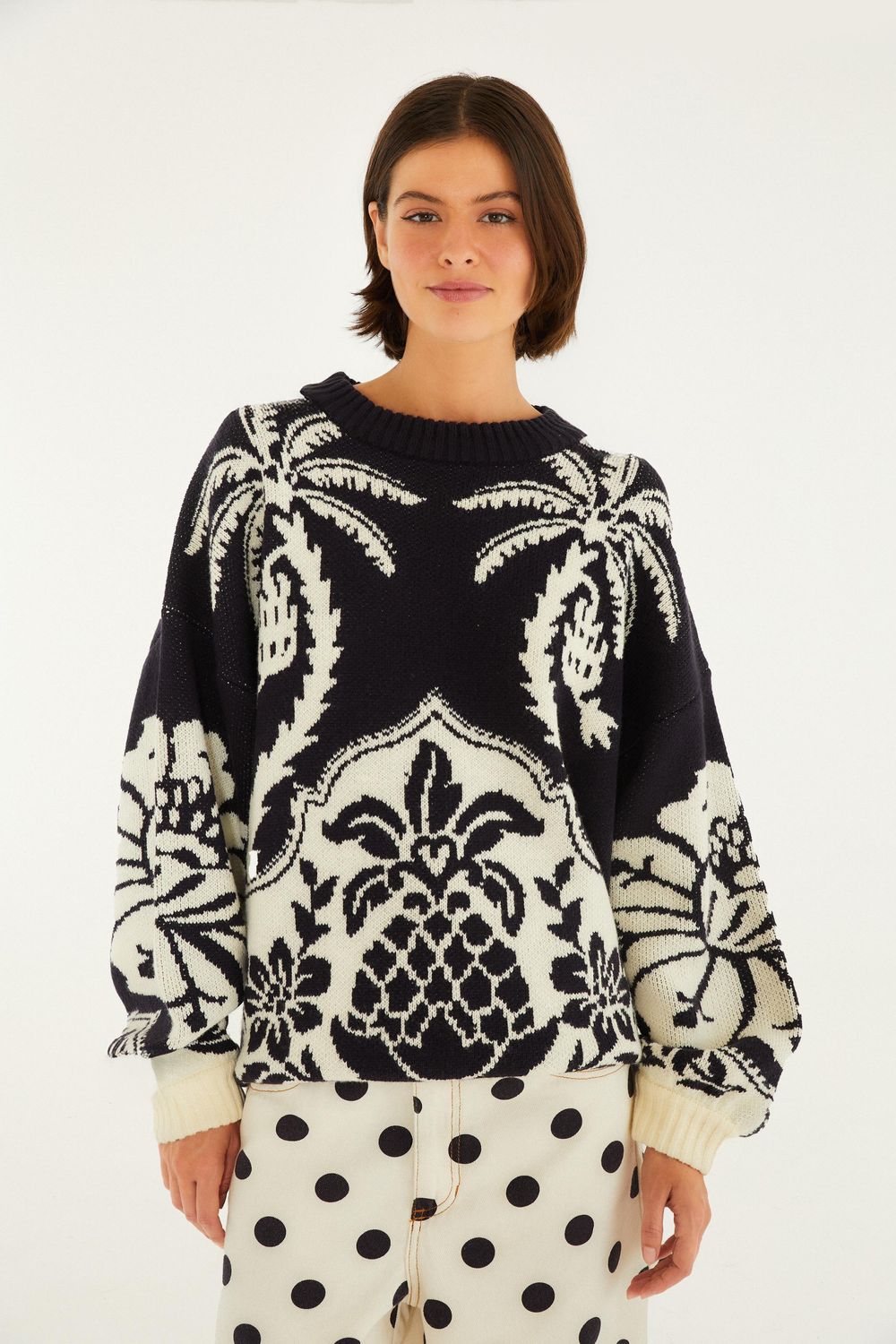 pull tricot guanacaste é um suéter de malha que combina charme e conforto em uma peça única. seu design conta com mangas longas, acabamento detalhado nos punhos e um corte casual que proporciona estilo em qualquer ocasião. perfeito para harmonizar com jeans ou calças de alfaiataria. FARM RIO original - verão 26.-