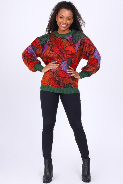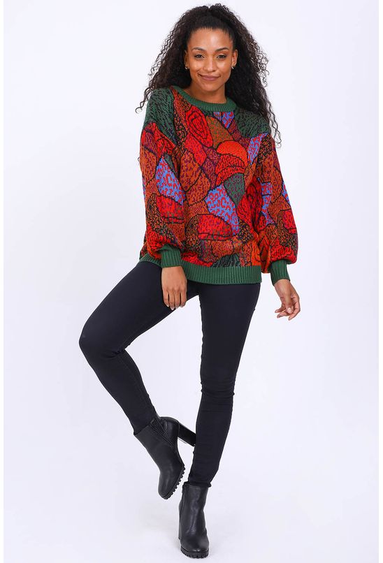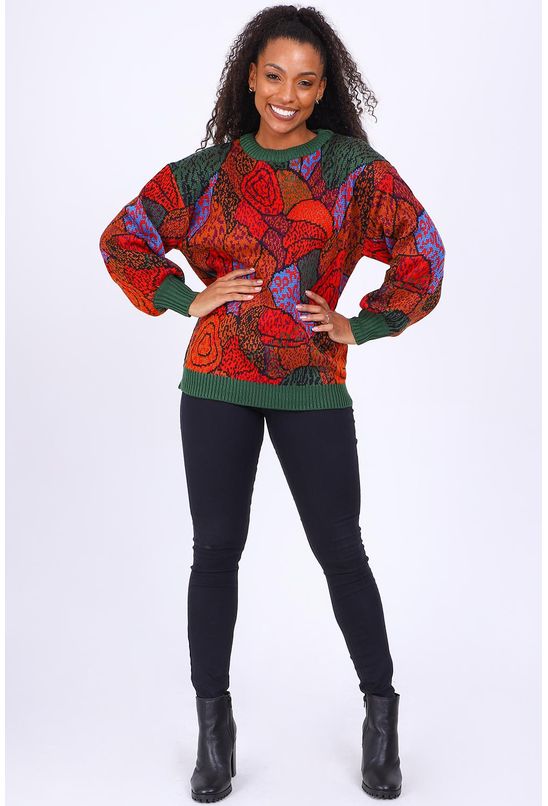 Pull farm decote careca, estampado , cor verde, vermelha, manga longa, tecido tricot. *as peças podem variar de estampa e tonalidade.