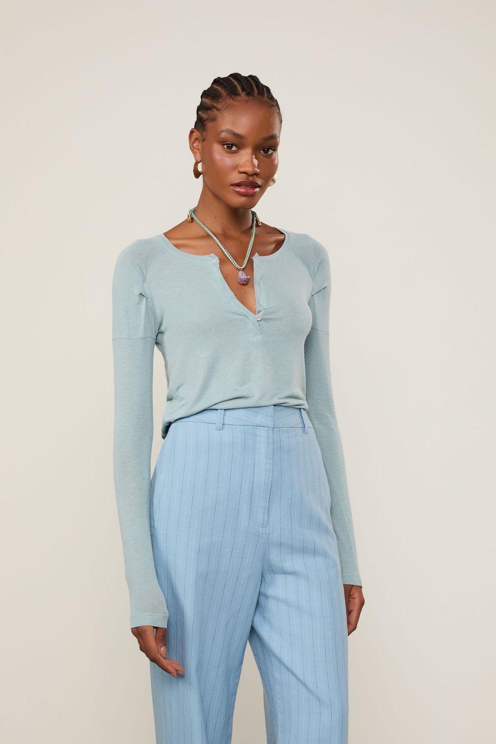 A Blusa Raglan em Malha surge em modelo com mangas longas, comprimento clássico, decote em V e abotoamento frontal. Uma escolha versátil e moderna.