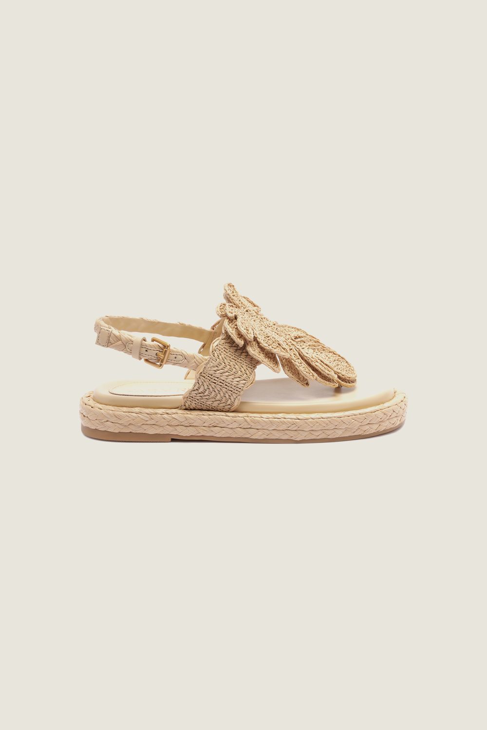 sandália rasteira ?monstera ráfia. o modelo tem uma plataforma revestida em corda de ráfia, uma tira em trança de ráfia que passa entre os dedos e conecta a uma tira larga em crochê de ráfia na horizoltal e aplicação sobreposta de duas peças também em ráfia bordada no formato de maxi folha. possui ainda tira em torno do calcanhar, fechando em fivela metálica lateral. possui palmilha em PU da cor do modelo, assinatura original e uma sola emborrachada em TR. esta é uma peça exclusiva da linha Apé, a nova linha de calçados FARM Rio.-