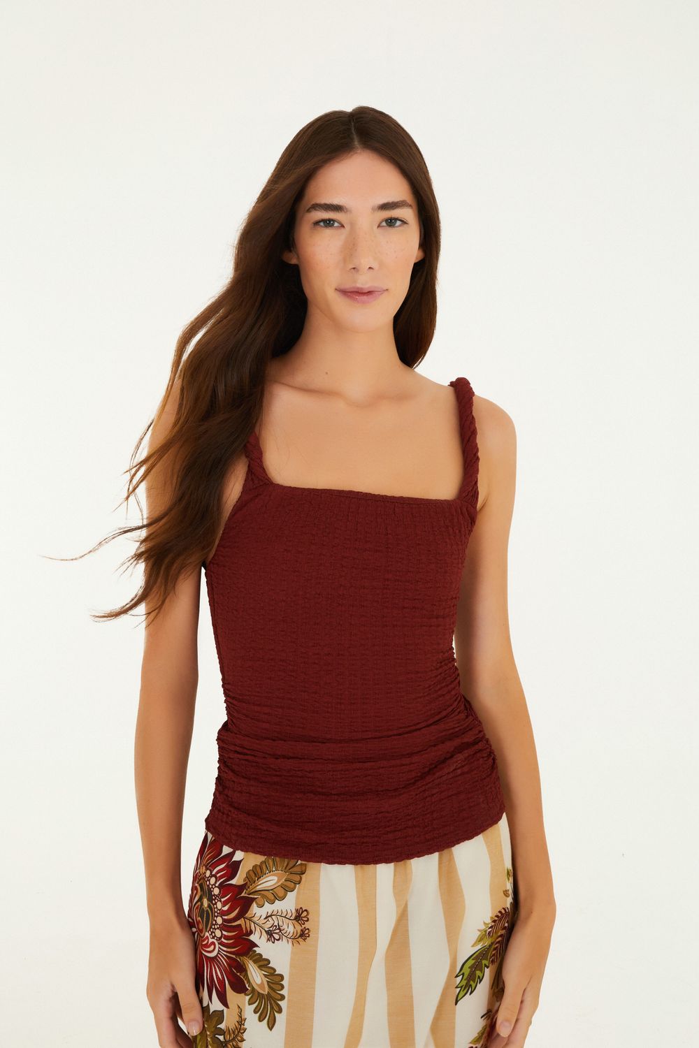regata alça torcida textura. apresenta alças com efeito torcido que trazem um toque único e moderno. confeccionada com tecido texturizado, oferece um visual casual e autêntico. o corte é reto, garantindo uma modelagem confortável para diferentes momentos do dia. ideal para compor looks versáteis e cheios de personalidade. FARM RIO original - verão 26.-