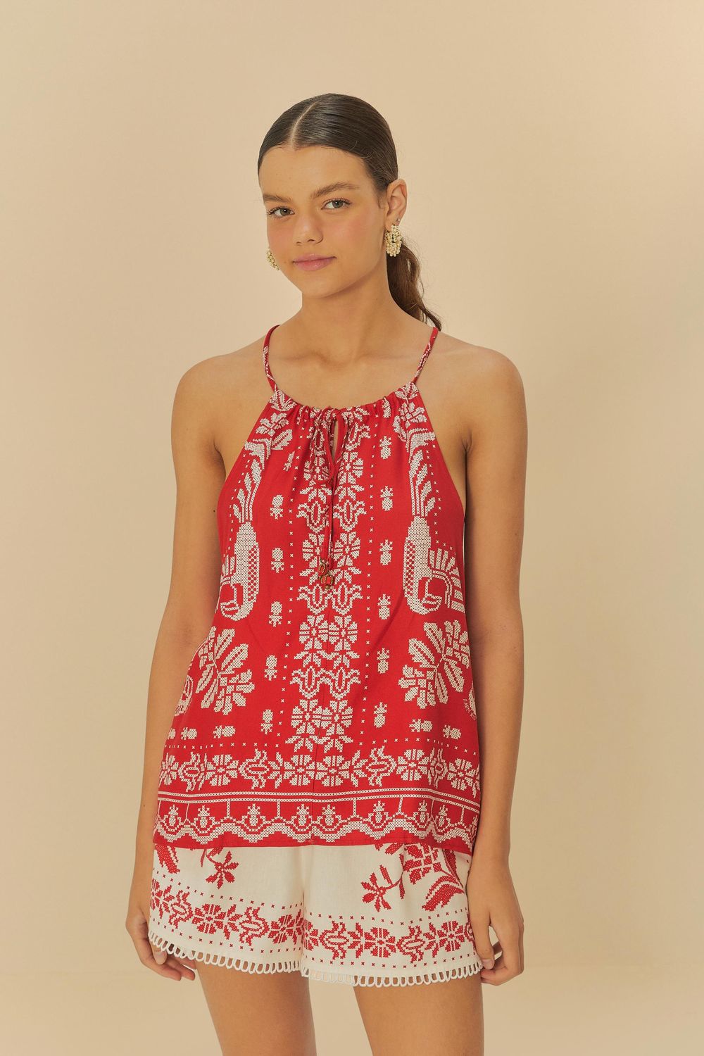 regata alcinha estampada relicário tropical. com leveza e toque fresco, essa peça traz alças finas reguláveis e decote suave, ideal para dias ensolarados. perfeita para passeios ao ar livre ou encontros casuais, a modelagem solta proporciona conforto e estilo. disponível em cores que elevam o astral do seu guarda-roupa. FARM RIO original - inverno 25.-