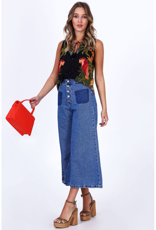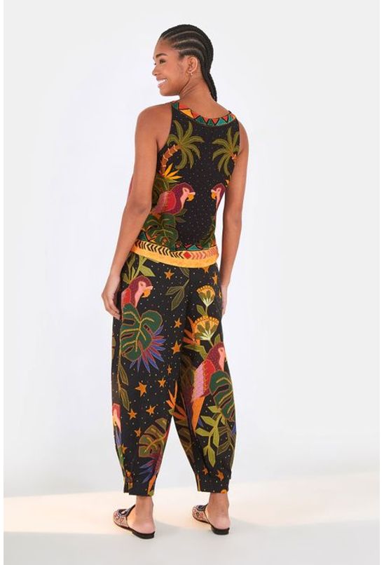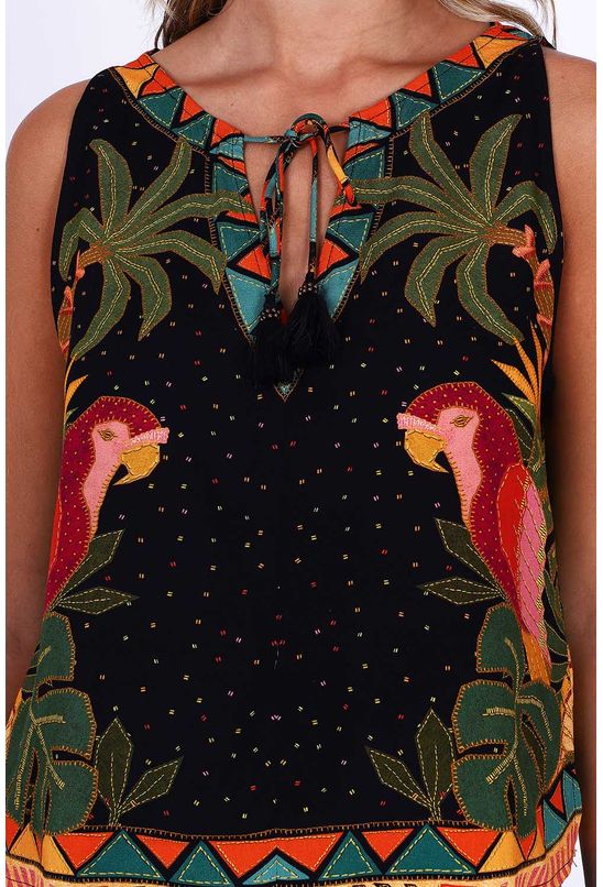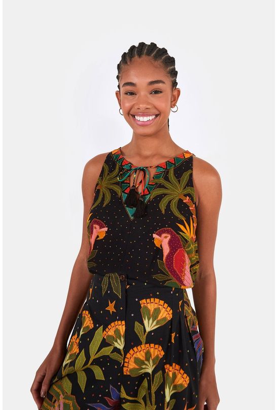 Regata arueiro, preta estampada, modelagem reta com decote careca com amarração. *as peças podem variar de estampa e tonalidade.