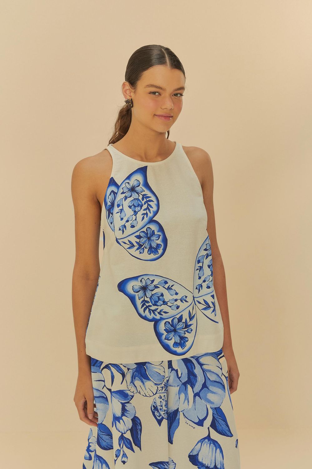regata borboleta de porcelana. uma peça que eleva qualquer look casual. com decote discreto e alças médias que proporcionam conforto e leveza, ela é perfeita para dias ensolarados. a modelagem solta permite liberdade de movimento, ideal para encontros informais ou passeios ao ar livre. FARM RIO original - inverno 25.-