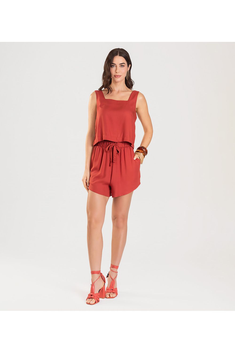 A regata cropped feminina Dianna, é confeccionada em tecido plano de viscose sarjada que proporciona caimento encorpado e elegante a peça. Possui decote quadrado que valoriza o colo, e detalhe de pence frontal, garantindo um caimento perfeito e estruturado. Versátil e moderna, é a peça ideal para compor looks frescos e sofisticados, unindo elegância e praticidade para diversas ocasiões. Para um visual estiloso e monocromático, use a regata com o shorts da mesma coleção.-