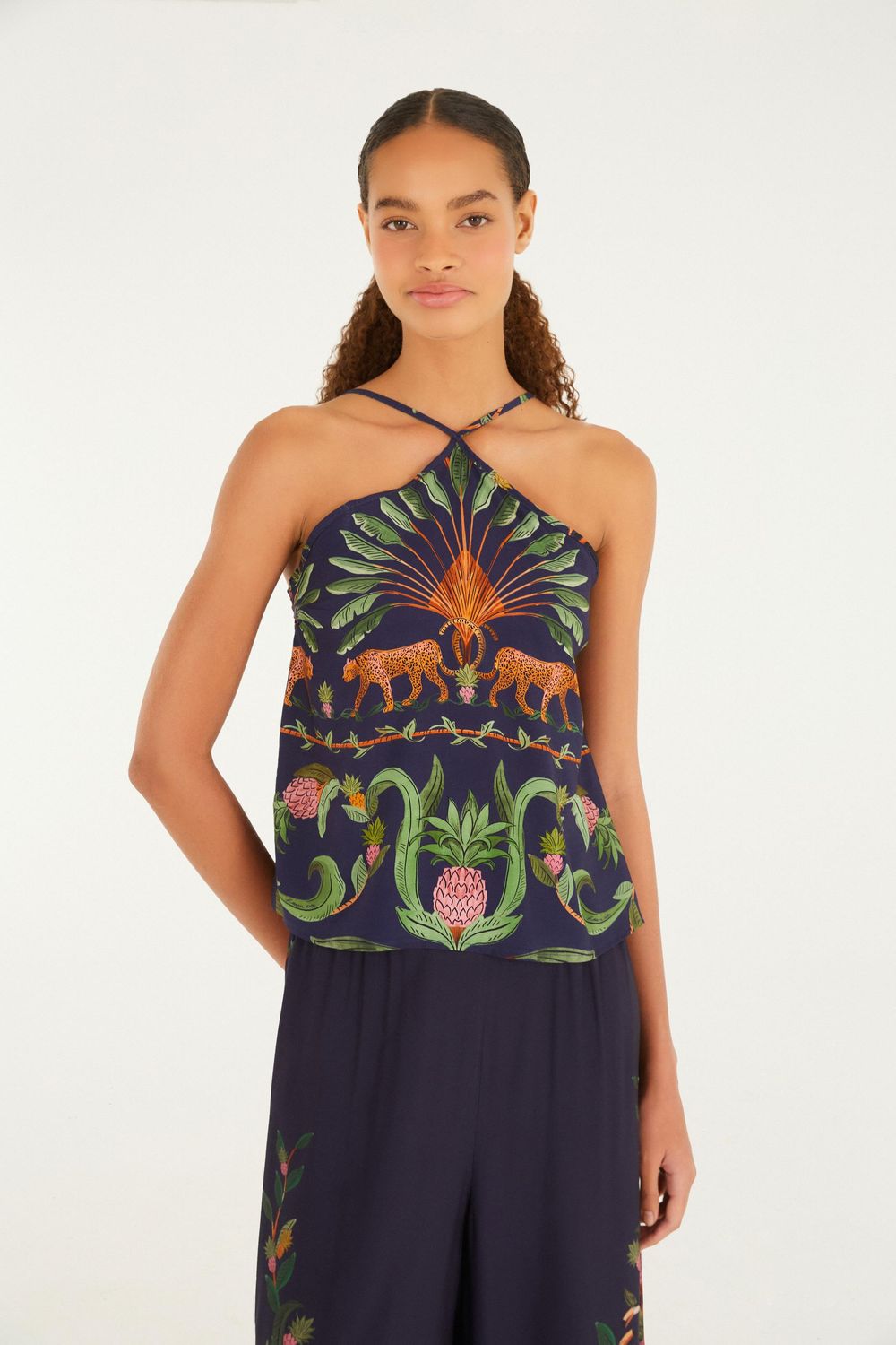 regata estampada floresta doce. traz alças finas que se cruzam no pescoço e proporcionam um charme adicional ao decote. com um corte fluido e leve, exibe um design único que é perfeito para ocasiões casuais ou eventos ao ar livre. peça chave que complementa qualquer guarda-roupa com um toque exclusivo. FARM RIO original - alto inverno 25.-