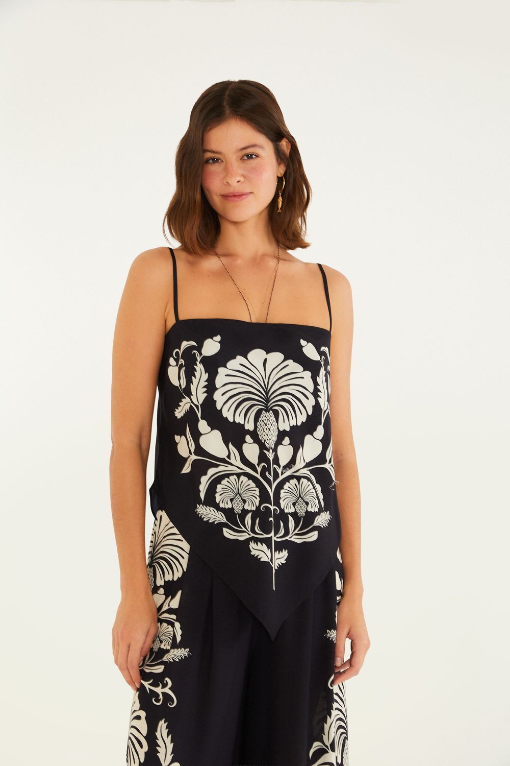 regata estampada sintra. possui alças finas com acabamento delicado e modelagem fluida que proporciona leveza ao vestir. perfeita para um passeio casual ou um encontro descontraído. o charme da peça está nos detalhes únicos e no caimento solto, tornando-se um verdadeiro convite ao estilo. FARM RIO original - verão 26.-