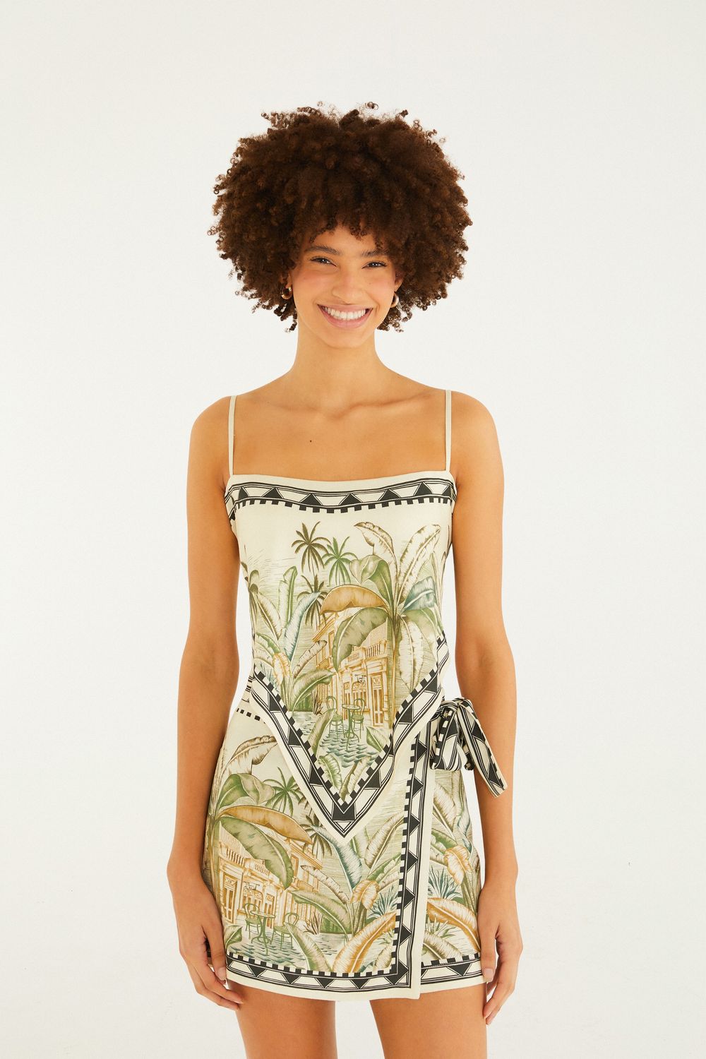 regata teresa lenço traz o encanto do verão com alças finas delicadamente ajustáveis e um corte reto que valoriza o conforto. o detalhe da amarração lateral adiciona um toque charmoso, enquanto o tecido fresco é ideal para dias de lazer ou encontros casuais. FARM Rio, coleção Carioca - inverno 26.-