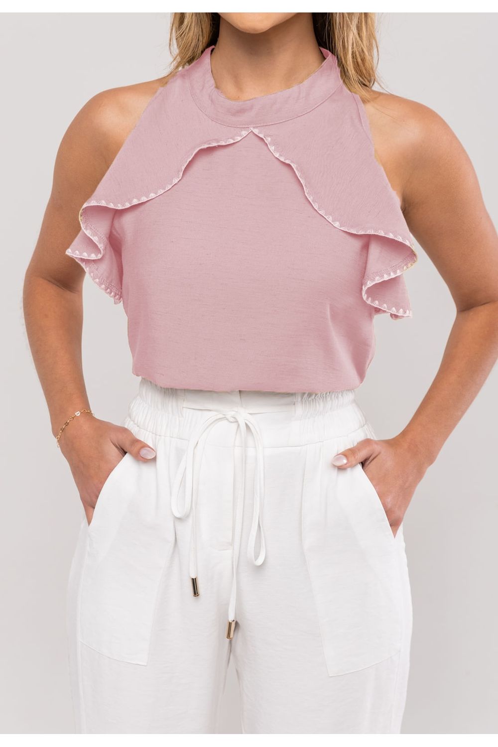 Seu recorte sem mangas valoriza os ombros, enquanto o babado frontal com acabamento em bordado delicado acrescenta movimento e feminilidade à produção.