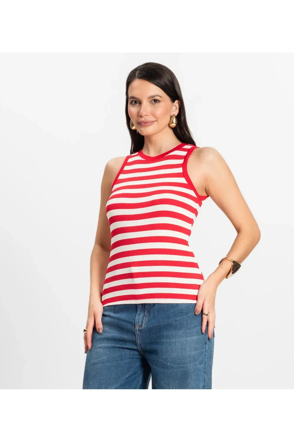 Regata Feminina Rovitex confeccionada em ribana de viscose com listras modernas, ideal para o dia a dia. Possui acabamento no decote e nas cavas com viés do mesmo tecido, garantindo conforto e bom caimento. A barra tem acabamento com costura dupla, proporcionando maior durabilidade e um visual clean. Versátil e fresquinha, é perfeita para compor looks casuais com muito estilo.-