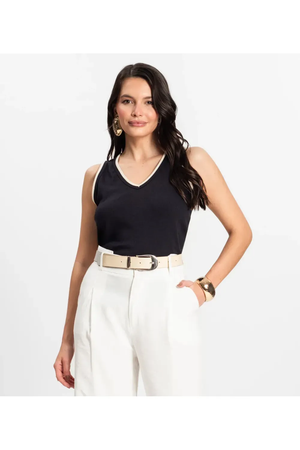Regata confeccionada em ribana, ideal para compor looks confortáveis e modernos. Possui decote em "V" com acabamento em friso de ribana combinado com meia malha, garantindo um visual limpo e bem estruturado. As cavas também têm acabamento em friso para maior durabilidade. A peça conta com bainha dupla na barra e etiqueta interna nas costas, proporcionando um acabamento discreto e confortável.-