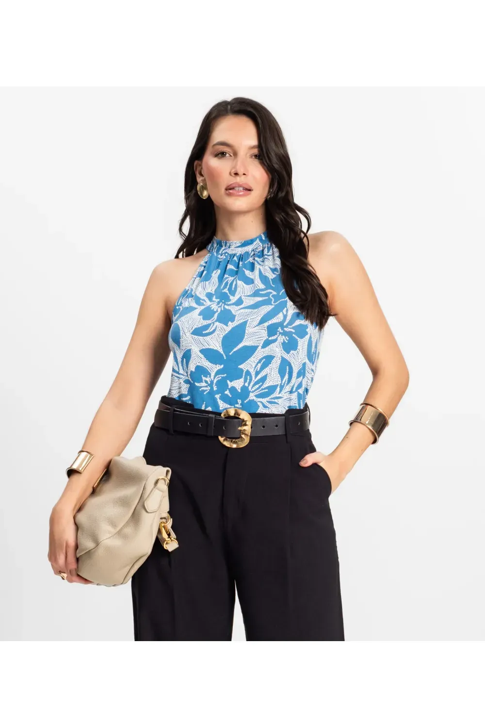 Regata Feminina Rovitex confeccionada em viscotorcion leve e confortável. Possui gola alta com detalhe de amarração nas costas, franzido frontal, cavas com acabamento diferenciado e recorte central nas costas. A peça conta ainda com estampa rotativa moderna e barra com acabamento reforçado. Ideal para compor looks elegantes com toque sofisticado e fresquinho para os dias mais quentes.-