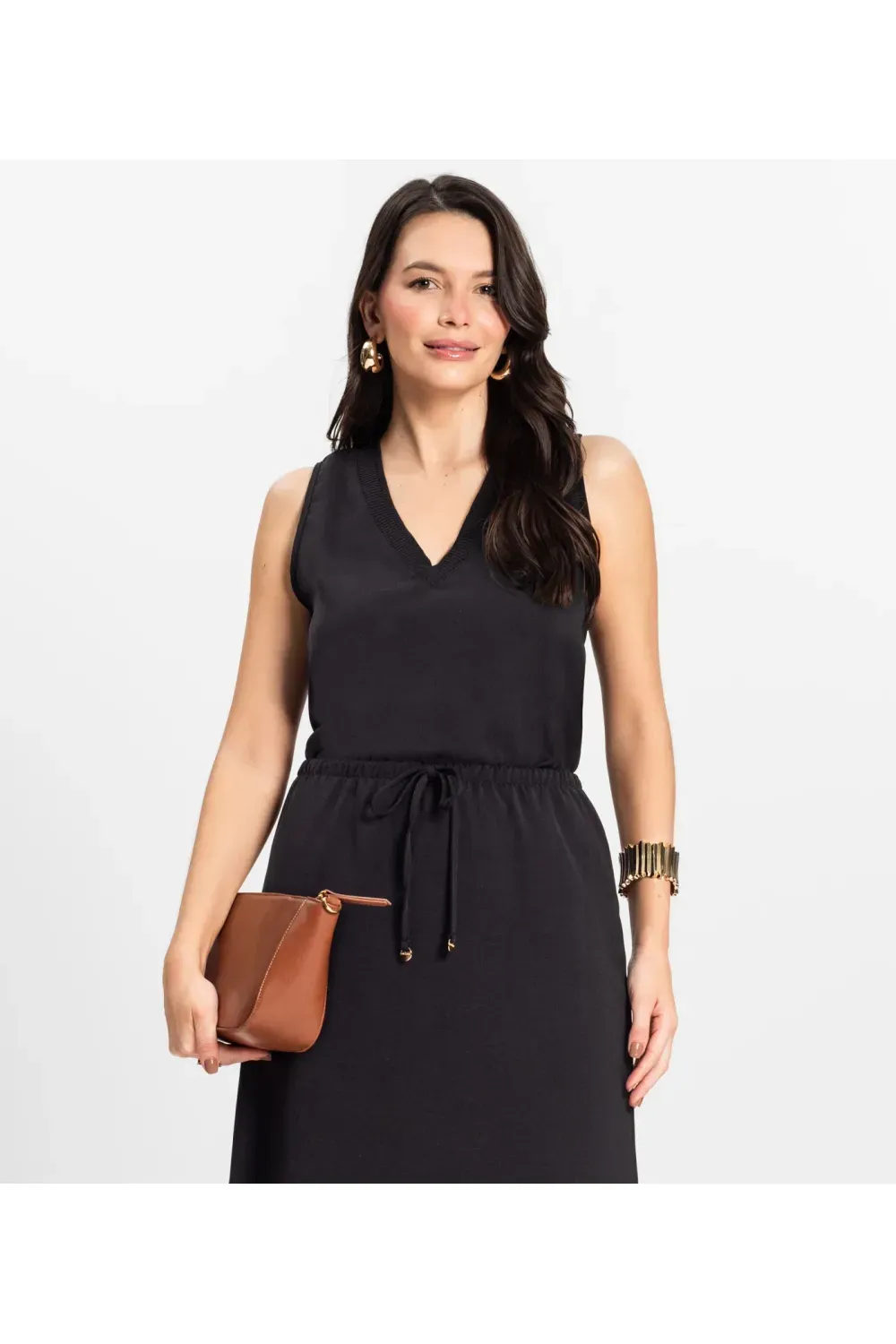 Regata feminina confeccionada em Twill Cey, ideal para looks frescos e elegantes. Possui decote em ¿V¿ com acabamento em retilínea e pesponto aparente, conferindo charme ao visual. As cavas são finalizadas com friso para maior conforto e estilo. A barra tem acabamento com bainha estilo lenço, garantindo leveza e um caimento impecável. Peça versátil para compor produções casuais ou mais arrumadas.-