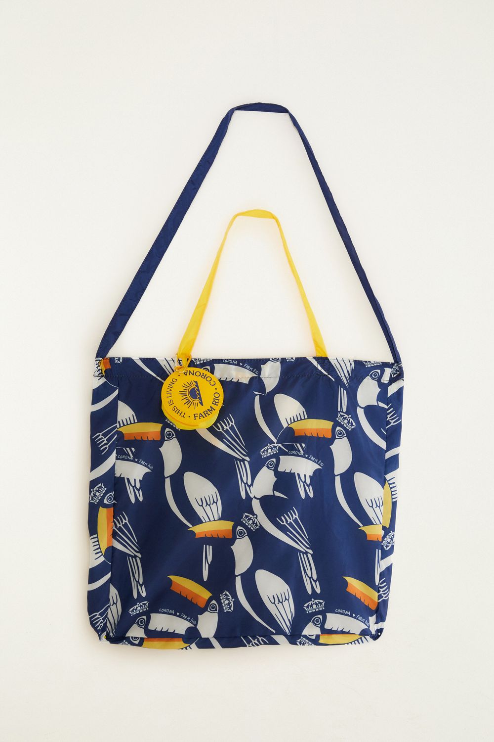sacolinha dobravel. compacta, é feita em nylon estampado e acompanha mini bolsa. This is living com sotaque carioca: esse produto faz parte da parceria FARM Rio + Corona.-